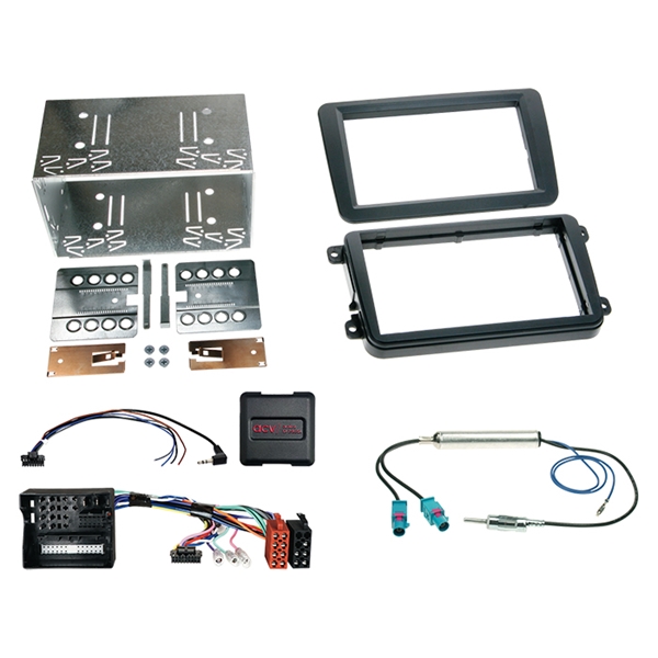 Kittet indeholder alle nødvendige komponenter til udskiftning af OEM HU. Afhængigt af bilens udstyr medfølger alle adaptere og interfaces, der kræves for at drifte retrofit-enheden og genskabe bilens funktioner.