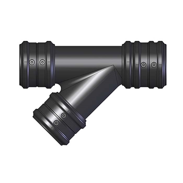 3-vejs kobling med 45-graders gren. De 3 åbninger har diameter 75 mm