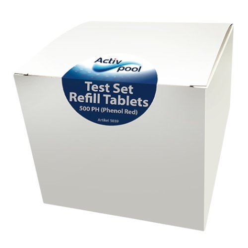 Kasse med 500 Red Phenol tabletter til Activ Pool Test Set PH/Chlorine/Bromine (5039) og Test Set PH/Active Oxygen (5053).