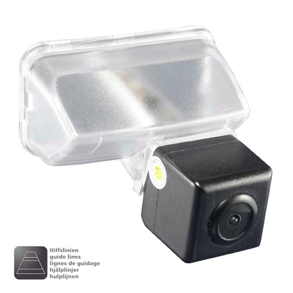 Mini-kamera med køretøjsspecifikt nummerplade lysglas, som har enkel samling ved omskiftning af det originale nummerplade lysglas. VS3-CI23 har et professionelt systemkabelsæt i tilstrækkelig længde og med stikforbindelse til bilen. Takket være stikket med en lille diameter, er kablet lettere at lægge. Der er ekstra ledning til signaltransmission, f.eks. strømforsyning eller baksignal, og der er hjælpelinjer i bakkameraet, som kan aktiveres eller deaktiveres.