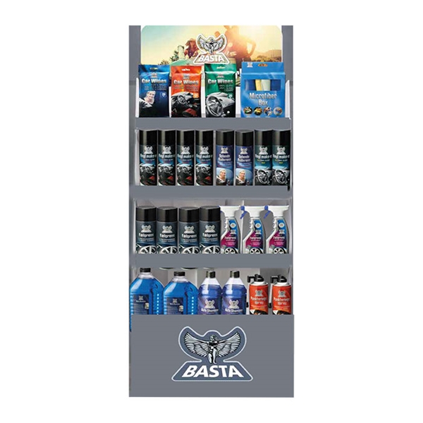 Smart bilpleje display med alle de mest populære produkter fra Basta’s brede sortiment.
