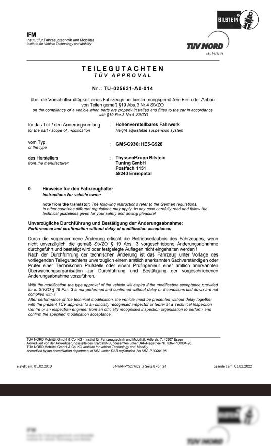 Der medfølger normalvis en forenklet TÜV-godkendelse, når du bestiller en gevindundervogn, et sænkningssæt eller en sportsundervogn.