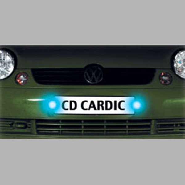 Nummerpladebolt med indbygget LED lys, der lyser rød, grøn og blå, når parkeringslyset er tændt.