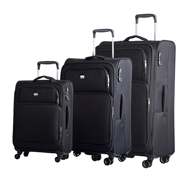 Sættet indeholder: 3 stk. kufferter kabine-, mellem- og stor størrelse i sort blødt materiale