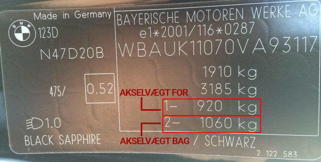 På typepladen kan du se informationer omkring din bils for- og bagakselvægt. Du skal være særligt opmærksom på disse 2 tal: