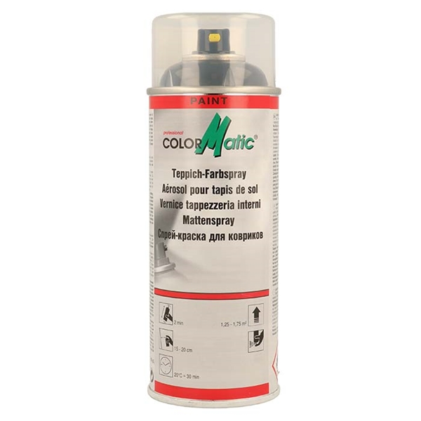 ColorMatic Tekstilspray er en brugervenlig spray til genopfriskning og indfarvning af tekstilmåtter, tæppegulve, tekstilbilmåtter og -tæpper inden for biler og brugskøretøjer. Også god klæbeevne på gummi og plast. Giver god vedhæftning og bevare elastikteten.
