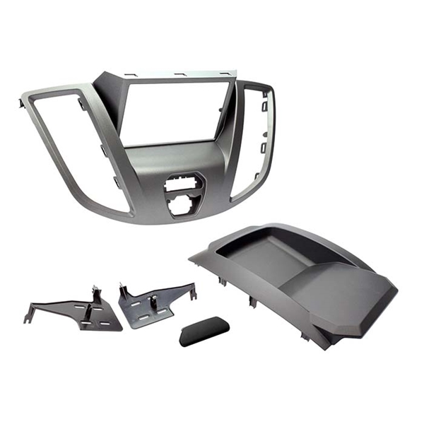 Ford Transit 2-DIN Fascia plate i grå. Til køretøjer uden OEM 4,2 "skærm. Udskiftningspanelet øverst på instrumentbrættet giver plads til 2-DIN uden at gå på kompromis med det originale instrumentbræt. Til montering af 1-DIN og 2-DIN enheder. Den kræver OEM-dele fra Ford; advarselslampe og airbag-advarsel (varenr: 1799698) eller kortholder (varenr: 1832265) og advarselstrekant- og dørlåskontakt (varenr: 1519127).