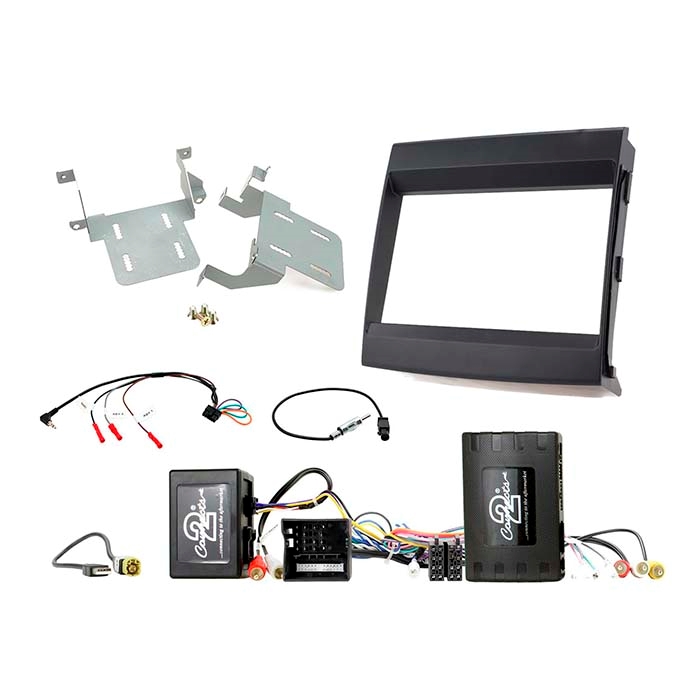 Sættet leveres med en 2-DIN radioramme i farven mat sort, interface til ratbetjening, Fakra antenne adapter og et universelt patch kabel (CTMULTILEAD.2).