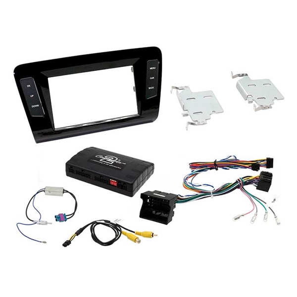 Passer til Skoda Octavia III 2013>. Adgang til bilens menu og indstillinger beholdes via den aktive ramme og det avancerede Infodapter interface. Grafik visning af eventuelle originale parkeringssensorer og klimaanlæg. Løsningen til Octavia III kræver et multimediecenter med indgang for bakkamera. Bemærk at der ikke er plads til 2-DIN multimediecentre som fylder meget i dybden, f.eks. modeller med motoriseret frontpanel. Adapter for original USB og AUX kan bestilles under 21CTSKODAUSB.