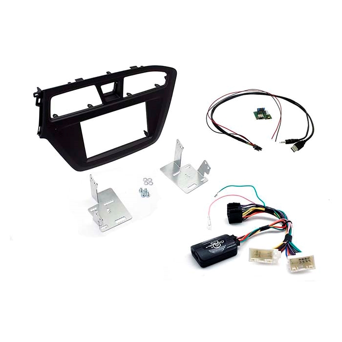 Hyundai i20 installations kit. Leveres med sort dobbelt DIN Fascia, ratkontrolinterface, USB/AUX interface og universal patchledning.
