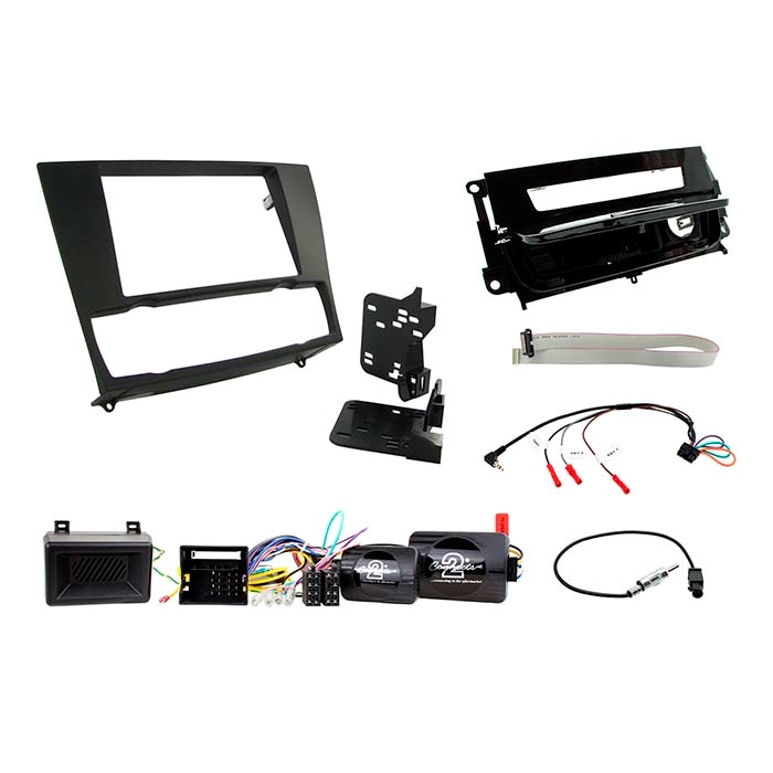 Sættet leveres med en 2-DIN radioramme i sort, askebæger indsats i Piano Black, CAN-Bus interface til ratbetjening og parkeringssensor, Fakra antenne adapter og et universelt patch kabel (CTMULTILEAD.2).