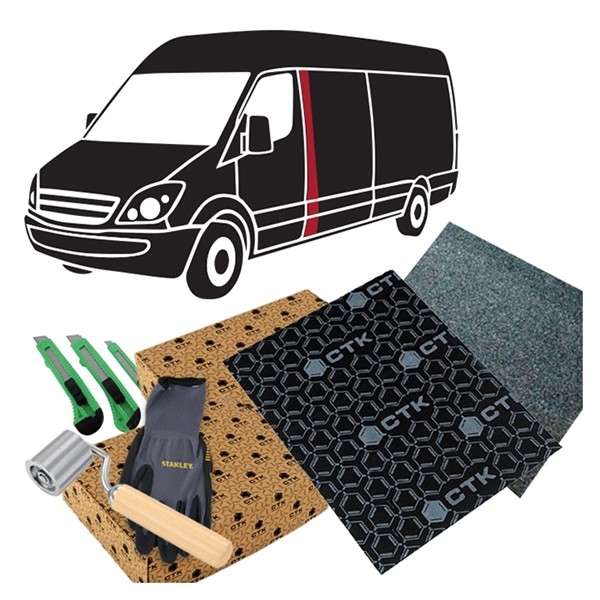 Komplet CTK Støjdæmpningspakke til bagvæggen på varevognen  - Grå Har du meget støj i din varevogn, og er du træt af ikke at kunne føre en ordentlig samtale på grund af støjen? Mange varebiler er sjældent støjdæmpet fra fabrikken, men med vores lyddæmpningspakke til bagvæggen kan du nu få dæmpet støjen betragteligt. Pakken indeholder alt hvad du skal bruge for at støj- og lyddæmpe bagvæggen i varebilen. Udover at det dæmper den irriterende støj, forbedrer det også dine højttalers ydeevne, og giver en mere behagelig oplevelse når du lytter til musik. Pakken indeholder: 2 x CTK Sandwich 8 mm støj- og lydisolering, 8 ARK, 1,48M² 1 x CTK Selvklæbende filt (grå) 1x5 meter 1 x CTK Roller 1 x Hobbykniv sæt 3 stk. 1 x Stanley Arbejdshandsker Denne støjdæmpningspakke indeholder nok materiale til at støjdæmpe bagvæggen / Varerumsadskillelse på de mest gængse varebiler som: Fiat Ducato, Peugeot Boxer, Citroen Jumper, Renault Master, Toyota Proace, Peugeot Expert, Citroen Jumpy, Mercedes Vito, VW Transporter, Ford Transit, VW Crafter, Mercedes Sprinter, MAN TGE og Iveco Daily. I pakken medfølger handsker, hobbykniv og CTK Rolle til påføring.