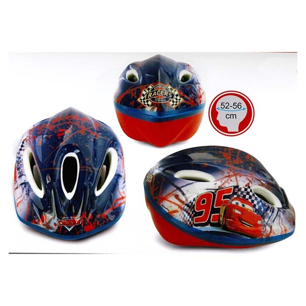 Cykelhjelm med Biler tryk med tilpasningsfunktion, som giver mulighed for at tilpasse hjelmen mellem 52 og 56 cm. Den har desuden spænder som også kan tilpasses og som har klips lukning.