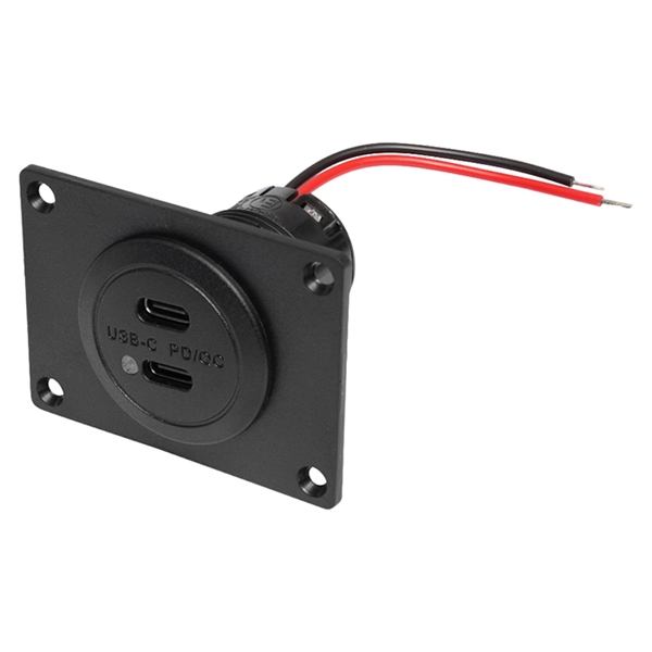 Robust USB-C dobbeltstikdåse med montageplade, designet til hurtig og sikker opladning af moderne smartphones, tablets og andre USB-C-enheder i 12–24 V installationer. Ideel til brug i køretøjer, både, campingvogne og industrielle applikationer.