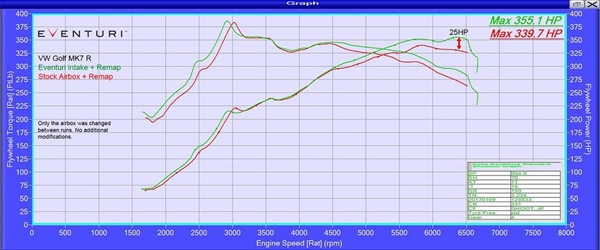 Følgende dynograf viser før- og efterresultater på en Golf 7 R (samme motor som Audi S1), som allerede havde en remap. Både den originale luftbox og Eventuri blev testet med samme remap installeret. Alle tests blev udført back-to-back samme dag med MOTORHUEN LUKKET VED ALLE TILFÆLDE.