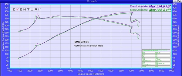 Den originale luftboks trækker luft ind bagfra kofangeren, hvilket giver en lang luftvej og dermed øger modstanden i systemet. Desuden skaber luftboksens kubeform turbulens, især hvor overgangen til de cirkulære MAF-rør finder sted. deres system erstatter luftboksene med Venturi-huse, som langt mere effektivt overgår til de cirkulære MAF-rør og bevarer laminær luftstrøm. Filtrene trækker luft fra et afskærmet område i motorrummet, som er mættet med kold luft fra de integrerede tågelygte-indtag. Ved at holde indløbstemperaturen lav og forbedre luftvejens effektivitet, kan motoren producere mere kraft. Grafen nedenfor viser en sammenligning mellem den originale luftboks og Eventuri-indtaget på en standardbil med standardmotorstyring og udstødning. Dynotestene blev foretaget samme dag og med lukket motorhjelm.