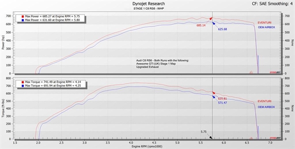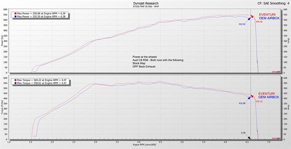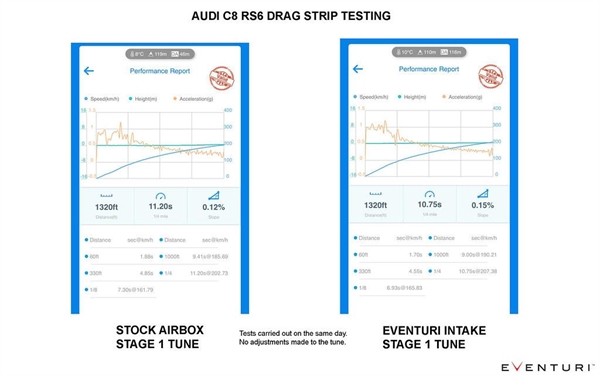Når alle mål er opfyldt, leverer deres C8 RS6 indsugningssystem på alle fronter og tillader turboerne at generere boost mere effektivt. Dette resulterer i forbedret gasrespons og markante effektforøgelser, testet uafhængigt som stiger med højere tuningniveauer. De opmålte ydelsesgevinster er et resultat af det komplette system Eventuri har udviklet fra airbox‑basis til låg og indløb.