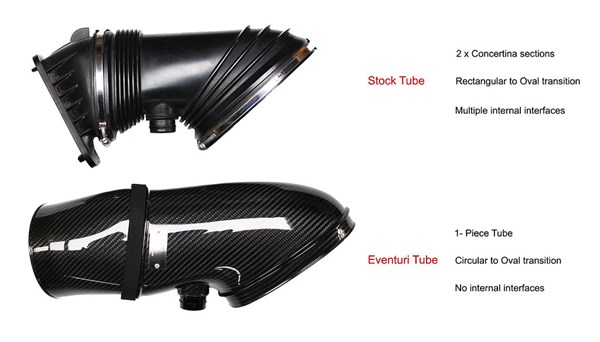 En vigtig udfordring var kravet om bevægelse sammen med motoren. I stedet for at bruge silikonekoblinger med fleksible sektioner (som ville introducere lignende samlinger som originalrøret), designede Eventuri selve røret til at være i stand til at bevæge sig med motoren. Røret har et komprimerbart neopren bånd rundt om den del som interfaces med original luftkasse. Denne sektion forsegler røret mod luftkassen men tillader bevægelse ind og ud af luftkassen som motoren bevæger sig. Ved at lade selve røret bevæge sig – har Eventuri kunnet skabe en luftstrømsvej som er så glat som muligt.