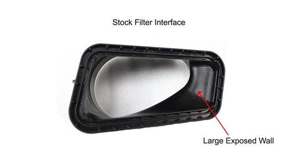 En anden ulempe ved originalrøret er den store indvendige flade ved forbindelsen til originalfilteret. Denne eksponerede væg får luften til at cirkulere, når den går ind i røret fra filteret på grund af det skarpe geometrisk skift fra den rektangulære filteråbning til den mere ovale rørform.