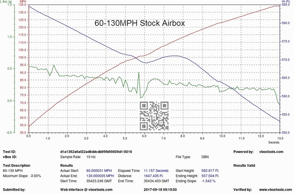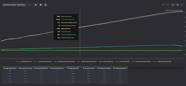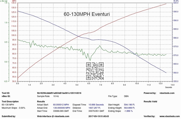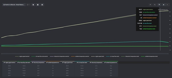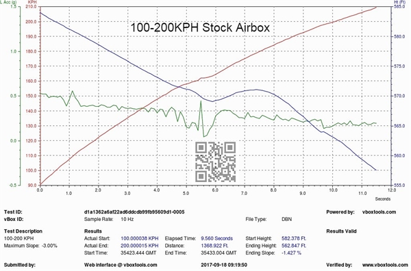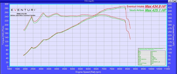 Luftstrømsvejen er meget glattere og som resultat, luftens hastighed som går ind i luftkassen stiger betydeligt. Dette tillader indsugningstemperaturerne at være lavere end uden scoopen : Eventuri har datalogget IAT’er på vej hvor Eventuri formåede at reducere indsugningstemperaturen med 2 grader ved brug af scoopen. For at illustrere scoopens effektivitet udtænkte Eventuri et simpelt eksperiment med en bladpuster for at generere flow og en vindhastighedsmåler til at måle hastigheden af luften som går ind i luftkassen. Eventuri fastgjorde blæseren i en position så den blæser luft direkte ind i den nederste kanal og placerede måleren inde i luftkassen for at måle hastigheden som går ind. Resultaterne viste en betydelig stigning i hastighed på næsten 50 % ved brug af scoopen. Den fulde testvideo kan ses under Video-fanen.