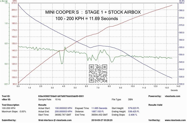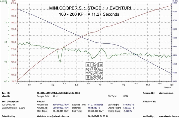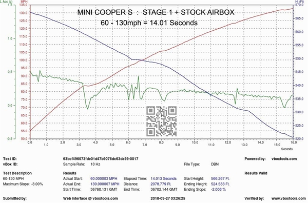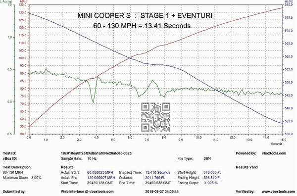 Endelig tog Eventuri Stage 1 MINI Cooper S til vejtest med en Vbox-enhed for at registrere acceleration fra 60-130mph (også 100-200Km/t). Til Vbox-testen havde deres testbil en stage 1-tuning for alle testløb. Testene blev udført på samme vejstrækning – igen samme dag for at holde variablerne minimale. Resultaterne viser, at med kun inntaget tilføjet, blev accelerationstiderne fra 60-130mph og også 100-200Km/t reduceret med ca. 0,6 sekunder, hvilket er en betydelig ændring ved sådanne hastigheder.