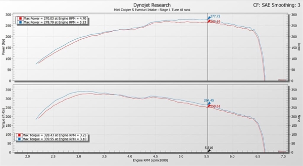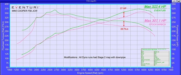 Dynamometertests blev udført på både en Cooper S og en JCW. Cooper S havde en stage 1 remap for både standard luftfilterboks og Eventuri. JCW havde en stage 2 remap og downpipe for både standard luftfilterboks og Eventuri. Cooper S viste en topgevinst på ca. 8hk og 11ft-lb drejningsmoment, men højere mellemrangegains på 15hk og 25ft-lb drejningsmoment med en god stigning gennem omdrejningstallet. På samme måde oplevede stage 2 JCW topgevinst på 15hk, men meget højere mellemrangegains på 27hk og 26ft-lb drejningsmoment med en meget god præstationsforbedring gennem hele omdrejningstallet. Disse ydelser blev målt efter kun at have udskiftet standard luftfilterboks med Eventuri-inntag – alle andre modifikationer var til stede for både standard luftfilterboks og Eventuri.