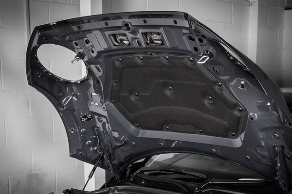 Ved at udnytte de eksisterende åbninger i motorhjelmen strækker ramperne på kulfiberscoopet sig igennem og leder luftstrømmen ind i kanalen. Her er undersiden af motorhjelmen med scoopet installeret.