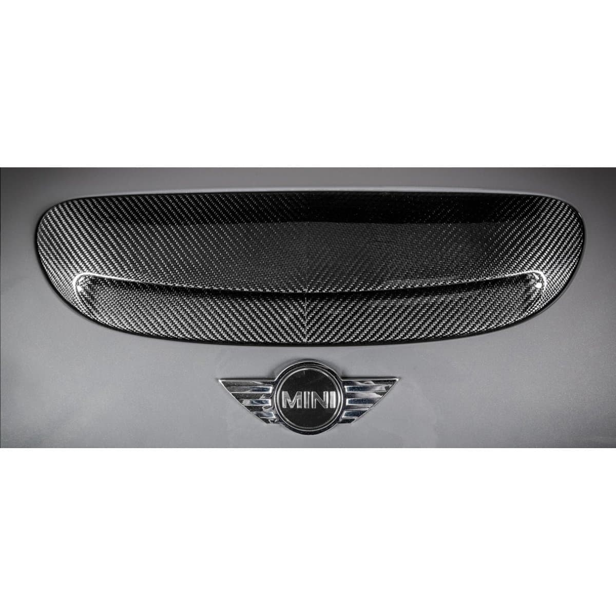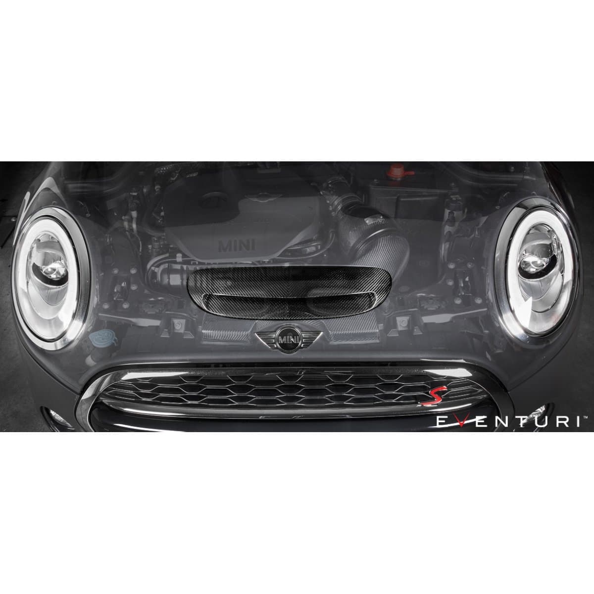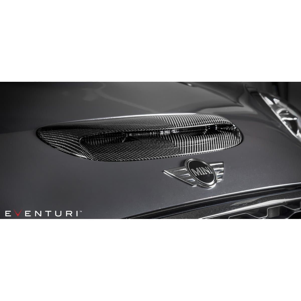 Det originale indsugningssystem trækker luft ind bagfra frontgitteret, over radiatoren. Åbningerne til indsugning af luft er relativt små og kan derfor føre til varmepåvirkning af indsugningen, især på en tunet Mini. Det originale motorhjelms-scoop giver ikke luft direkte til indsugningen, og da motorhjelmen allerede har 2 udskæringer under scoopet, besluttede Eventuri at udnytte denne funktion og udvikle scoopet på ny. deres scoop er en direkte erstatning for OEM-delen og klikker på plads med samme fastgørelsesmetode. Det har 2 indløbsramper, som leder ekstern luft gennem de eksisterende udskæringer på motorhjelmen og ind i indsugningskanalen (se nedenfor). Når bilen accelererer, tvinges mere luft ind i kanalen, hvilket holder indsugningstemperaturen lav og undgår varmepåvirkning. Scoopet har en redesignet profil med en længere overflade, der dækker åbningerne, hvilket også giver et mere aggressivt udseende. Fremstillet af 100% prepreg-kulfiber giver scoopet et utroligt æstetisk udtryk til bilen. For at fremhæve det æstetiske har Eventuri anvendt en V-formet vævning i kulfiberen, der giver en symmetrisk profil, hvilket passer godt, da scoopet sidder i midten af motorhjelmen.