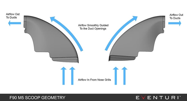 En anden vigtig designdetalje er den interne volumen i rørene, når de passerer gennem afstivningsbøjlerne. På F90 M5 skal indsugningssystemet passere gennem en oval åbning i afstivningsbøjlen på hver side før det når turboindløbene. Eventuri har formået at øge det interne volumen ved dette punkt, hvilket resulterer i mindre modstand.