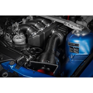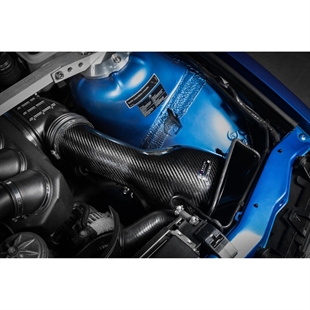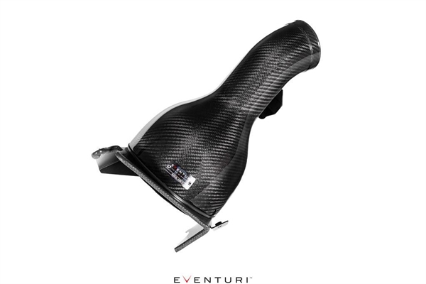Filterhuset består af deres skræddersyede generation 2 filter, aluminiumskrave, kulfiberkapsel med afskærmning og integreret MAF-rør. Kulfiberkapslen omslutter det omvendt monterede filter og former luftstrømmen jævnt ned til plenumet. Dette er en nøglefunktion i designet, hvor Eventuri har fjernet den snoede luftvej fra OEM-luftkassen og dermed reduceret tryktabet gennem hele systemet. MAF-sensorens forbindelse er flyttet til en mindre synlig placering, men fungerer stadig inden for samme parametre som OEM-systemet. Endelig har huset varmeskjold omkring filteråbningen for at forhindre varm luft fra motorrummet i at trænge ind og dermed holde indsugningstemperaturen under kontrol.