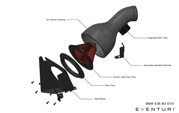 E36 M3 Eventuri-systemet benytter deres patenterede kulfiberhus, som giver en aerodynamisk effektiv luftstrømsvej fra filteret til motoren. Ikke bare endnu et keglefilter med en varmeskærm, men et unikt design som udnytter Venturi-effekten og opretholder laminært flow for at reducere modstand på motoren. Du kan læse mere om husets design og hvordan det fungerer HER.