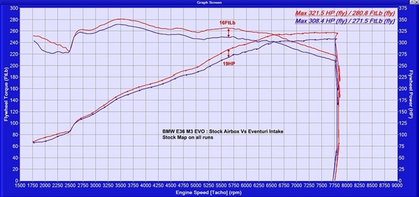Dette indsugningssystem er blevet uafhængigt dynotestet af Dream Automotive i Storbritannien. Testene blev udført direkte i sammenligning med den originale luftboks, og der blev lavet flere målinger med hver konfiguration. Eventuri har taget de bedste resultater fra den originale luftboks og de bedste fra Eventuri-systemet. Dyno-resultaterne viser en konsekvent forøgelse gennem hele omdrejningsområdet, hvilket kan tilskrives den mere jævne luftstrømsvej gennem indsugningssystemet til indsugningsplenumet. Ydelsesforøgelsen kan mærkes på vejen med forbedret gasrespons både ved delvis og fuld gas, hvor bilen trækker mere ivrigt helt op til det røde felt.