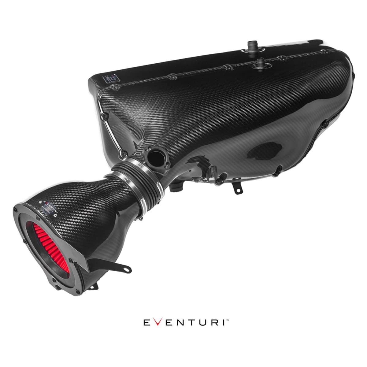Filterhuset består af deres specialdesignede generation 2-filter, rustfri stålbeslag og carbonfiberhuset. Carbonkapslen omslutter det omvendt monterede filter og leder luftstrømmen jævnt ned til plenumet. Dette er et nøgleelement i indsugningsdesignet, hvor Eventuri har fjernet de snørklede luftveje fra den originale airbox og dermed reduceret tryktabet gennem hele systemet. Det sikrer også, at luftstrømmen er jævn, når den når MAF-rørsektionen af airboxen, så sensoren fungerer fejlfrit.