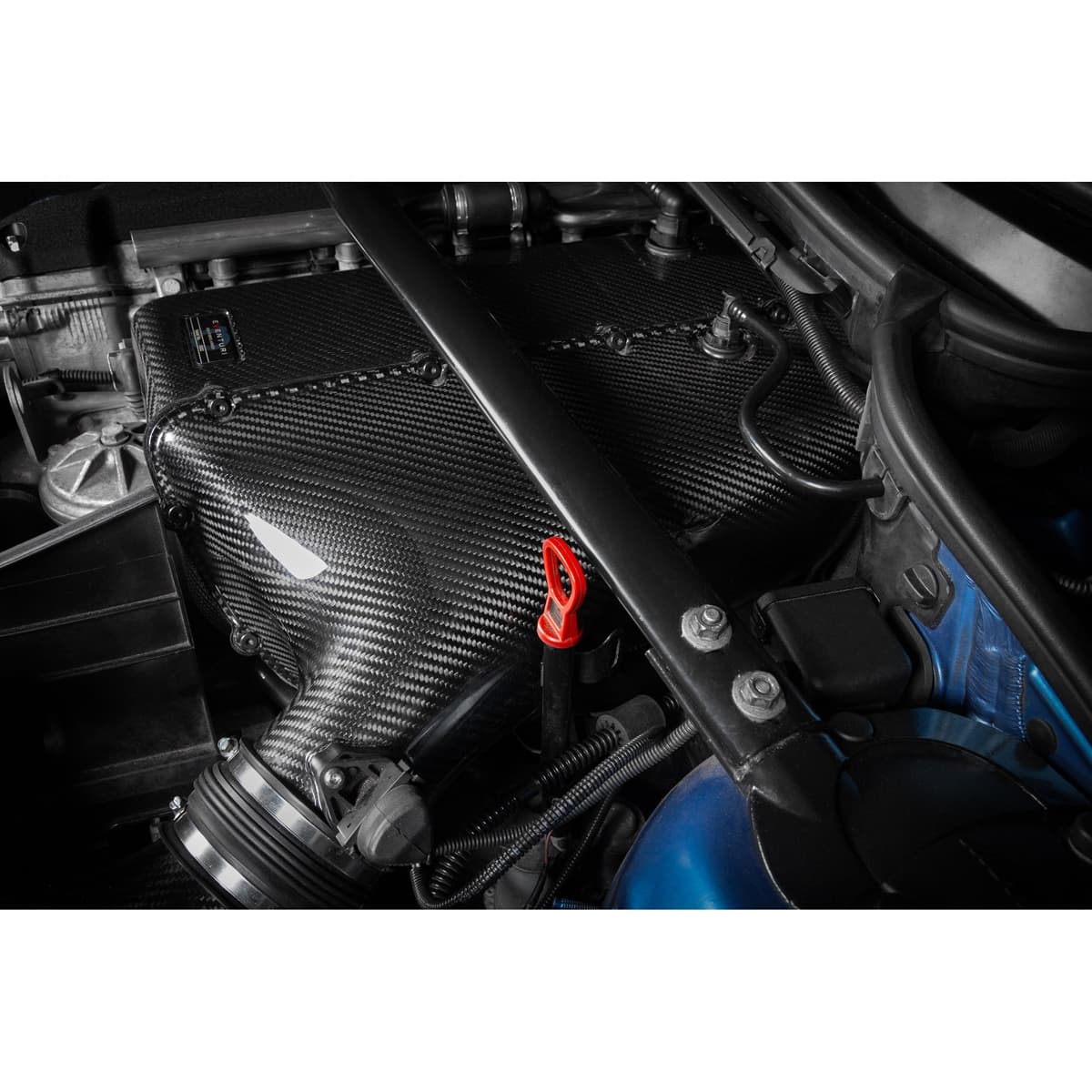 100 % præpreg carbonfiber med CNC-fræset krave – scoopen leder omgivende luft direkte ind i filteråbningen. Denne scoop klikkes blot på plads i højre forreste bremseduks og sender effektivt kold luft direkte ind i indsugningen. Den er designet til at optage halvdelen af ductens højde for stadig at lade luft passere til bremsesystemet. Scoopen er så effektiv, at selv efter hård kørsel føles aluminiumsringen ved indsugningen stadig kold at røre ved.