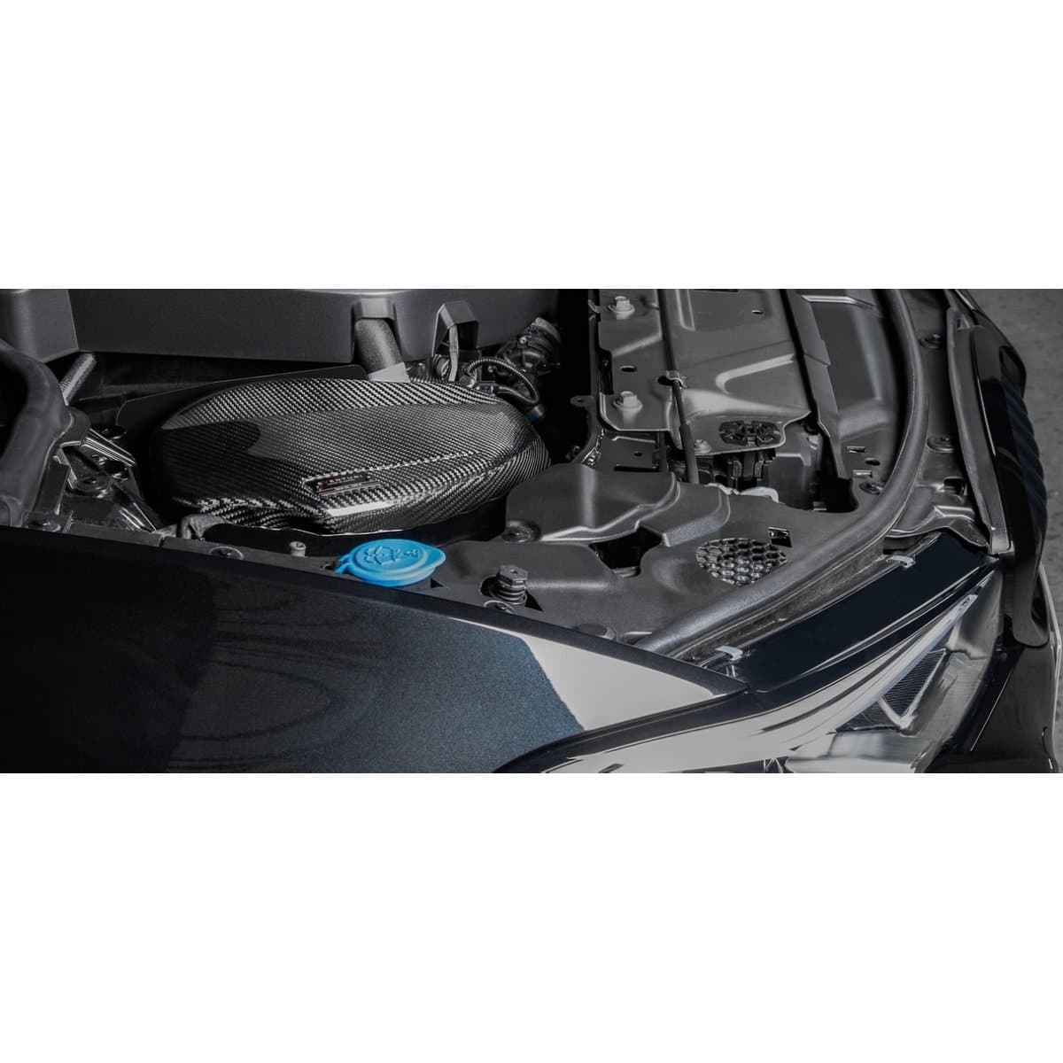 Fremstillet af pre­preg kulfiber, tjener luftboksen to formål – at forsegle filteret mod varme fra motorrummet og at give en dobbelt koldluftstilførsel. Da luftboksen er placeret ved siden af udstødningsmanifolden er det afgørende, at filteret er fuldt forseglet, så Eventuri designede luftboksen til at omslutte filteret og samtidig give et stort indvendigt volumen. For at forsegle indsugningsrøret har Eventuri designet en laserskåret plade med en gummitætning, som fastgøres til luftboksen. Indsugningsrøret passerer gennem pladen, og gummitætningen sikrer, at opvarmet luft ikke trænger ind i luftboksen. For yderligere at minimere varmeindtrængning er der et ekstra varmeskjold med et guldreflekterende lag på udstødningsmanifoldens side, som effektivt modvirker strålingsvarme.