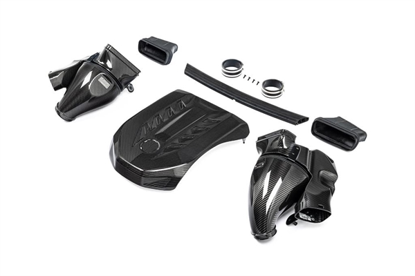 Filterhusene består af deres specialdesignede Gen 2 filtre, aluminiumsindsugningsskåle og rustfri stålbeslag. Carbonhylsteret omslutter det omvendt monterede filter og former luftstrømmen glat ned til OEM turboindløbene. Dette ændrer luftstrømsvejen fra OEM-luftboksen, hvor luftstrømmen går ind i bunden af boksen, ændrer retning med 90 grader gennem panelet og igen med 90 grader gennem røret. deres system er meget mere direkte med luftstrøm, der går ind foran i filterhuset og videre ind i turboindløbet uden pludselige retningsændringer. Resultatet er en glattere vej fra filter til turbo, hvilket betyder mindre modstand.