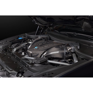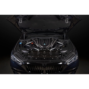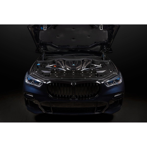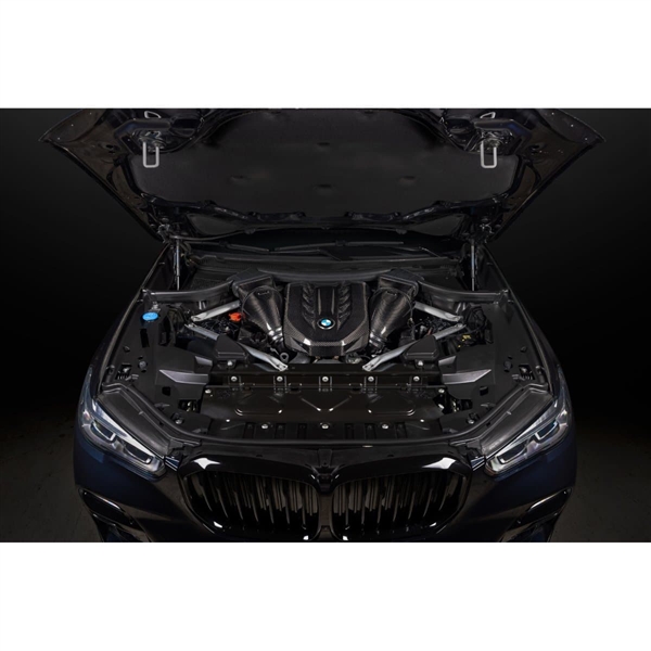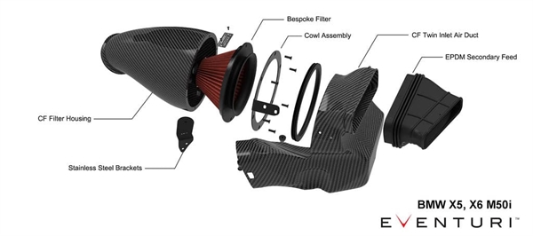 X5 M50i Eventuri-systemet bruger deres patenterede carbon fiber-huse med deres Gen 2 specialdesignede filtre, som sikrer en aerodynamisk effektiv luftstrømsvej fra filteret til turboerne. Det er ikke bare endnu et keglefilter med en varmeskjold, men et unikt design, som fremkalder Venturi-effekten og opretholder laminære strømforhold for at reducere modstanden på turbinen. Du kan læse mere om husets design og hvordan det virker HER.