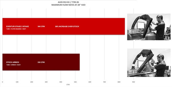 Indtagsrøret har en indvendig diameter på 103 mm eller lidt over 4" og en glat kurve fra filterhuset helt til turbo-indgangen. Selve filteret er designet specielt til dette indtag og har en stor ydre diameter på 210 mm eller 8,3" med en filtreringsoverflade på over 130.000mm². Det patenterede Venturi-hus er designet til at give maksimal intern volumen inden for RSQ3 motor-rummet og sikrer laminær luftstrøm til turborøret. Endvidere lukker fordybningen filteråbningen mod frontens slam-panel, men er ikke begrænset af kun den originale lufttilførsel. Eventuri har hævet fronten af kanalen for nu at give en ekstra åbning bag motorhjelmen, hvilket svarer til et ekstra hul på 7" diameter for luftindtagningen. Det resulterende system kan levere 840 CFM ved 28" H₂O samtidig med at indtagstemperaturerne holdes lave med det forseglede design.