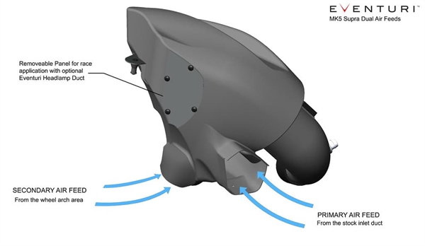 Ved at have en fuldt forseglet luftkasse opstår problemet med begrænset koldluftsindtag. Den originale luftkasse trækker luft fra én kanal, der går til fronten af kofangeren. Under udviklingen identificerede Eventuri et andet område at trække kold luft fra – et mellemrum mellem hjulkassen og karrosseriet, hvor luftkassen sidder. For at udnytte denne tilførsel forlænger Eventuri en scoop bagfra, som stikker ud i hjulkassen og kan ses bag fronthjulet efter installation. Denne sekundære tilførsel giver turboen mulighed for at trække fra et større område, hvilket reducerer begrænsning. Da scoopen strækker sig ind i hjulkassen, inkorporerede Eventuri også en intern stænkskærm for at afvise vand væk fra filteret. Animationen nedenfor viser begge tilførsler samt den interne stænkskærm.
