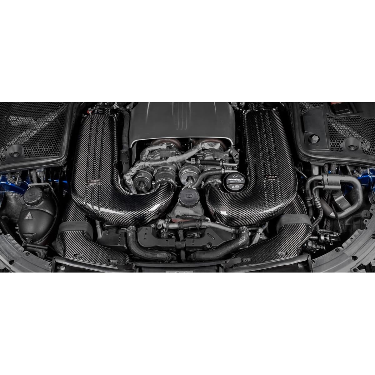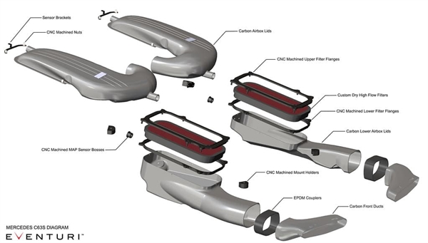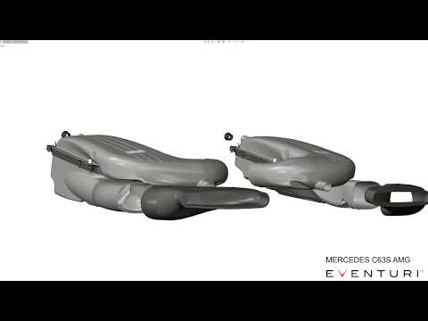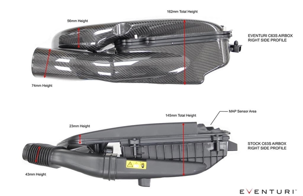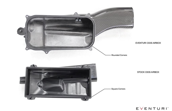 Luftkassekomponenterne består af øvre og nedre sektioner, som er adskilt af filterpanelerne. Hver sektion er omhyggeligt designet for maksimal intern volumen samtidig med at sikre en glat luftstrømsvej til turboerne. Det mest udfordrende aspekt af dette design var at øge den interne volumen af luftkasserne i et forsøg på at øge kapaciteten i forhold til standardluftkasserne. Da motorummet i C63S er så tæt pakket, kunne dette kun opnås ved at maksimere den totale interne højde af luftkasserne. Den største forøgelse kom fra at forøge de øvre låg på luftkasserne. Som det tydeligt kan ses, har Eventuri formået at opnå en betydelig forøgelse i volumen samtidig med at levere en glattere luftstrømsvej.