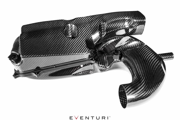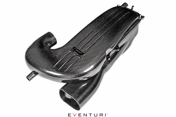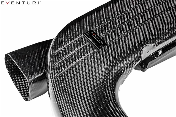 De sidste komponenter, som Eventuri har opdateret fra deres tidligere EPDM‑kanaler, er deres kulfiber frontkanaler. Disse forbinder til luftkasserne ved hjælp af deres special EPDM‑koblinger. Kulfiberkanalerne er formet til glat at overgå fra de ovale luftindgangsåbninger i slåpanelet til luftkasserne, samtidig med at den størst mulige volumen opretholdes.