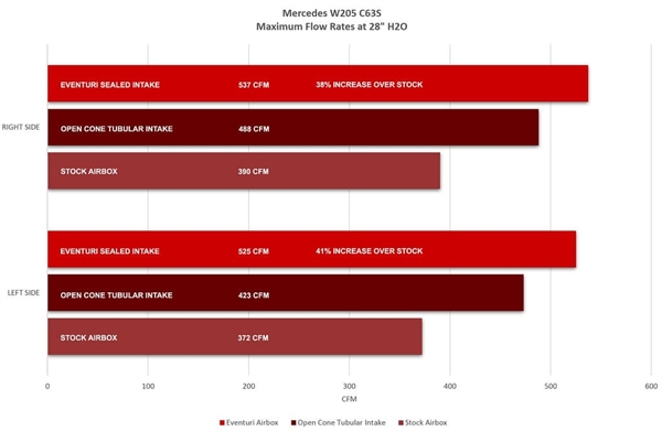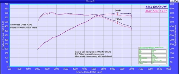 Følgende tests blev udført på en Insoric Road Dyno, der måler ydelsesdata på vejen. Tests blev udført i Tyskland af CF Dynamics på samme strækning af Autobahn samme dag mellem standard luftboks og Eventuri systemet. Denne C63S havde en trin 1 tuning. Som det ses, bliver standard luftboks en begrænsning efter 5000 rpm, og der blev opnået gevinster på 31 hk og 39 Nm med Eventuri indsugningen.