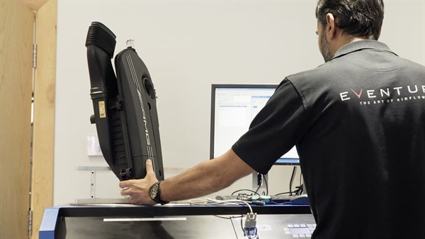 Eventuri udførte flowrate-tests med en Superflow SF-1020 for at måle maksimal flowrate ved et trykfald på 28" H2O. Tests blev udført samme dag under kontrollerede forhold med samme testopstilling for hver system. Eventuri testede deres forseglede indsugning med specialfilter, standard luftboks med standardfilter og en åben kegle-type indsugning med indsugningsrør i samme diameter som standard turboindløb. Både venstre og højre luftbokse blev testet.