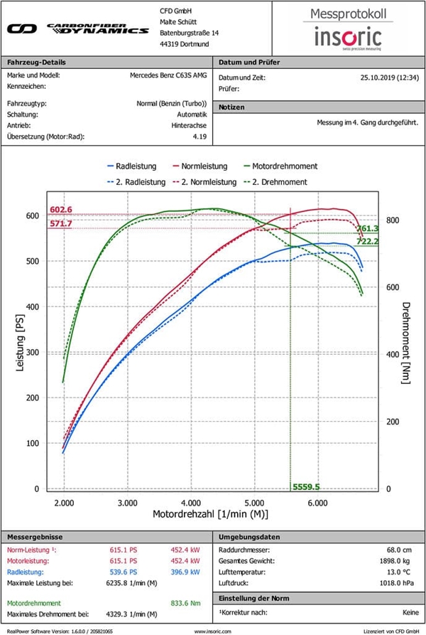 Dynotests blev udført både på en fuldstændig standard C63S og en trin 2 C63S med downpipes og remap. Nedenfor ses dynografen for trin 2 bilen, som havde samme tuning ved alle målinger, og kun luftboksen blev udskiftet. Vigtigt er, at motorhjelmen var lukket under alle tests for at simulere vejforhold. Dynotest med åben motorhjelm – især med åbne keglefilter-indsugninger – giver ikke en pålidelig indikation af, hvordan indsugningerne påvirker effekten. På vejen er motorhjelmen lukket, og al varmen fra turbinerne er fanget i motorummet. På C63S er denne varme intens, hvorfor et tæt system er altafgørende. Dynotest af et åbent keglesystem med åben motorhjelm vil vise effektforøgelse, men på vejen vil varmesugning fra de åbne kegler trække varm luft ind, hvilket forringer effekten markant. Med højere lufttemperatur og lavere densitet kan turbinerne ikke opbygge lige så meget boost, hvilket giver lavere effekt. Desuden, når bilen accelererer, vil de åbne kegleindsugninger fortsætte med at trække varme fra motor og turboer, der producerer meget varme, som kan ses ved, at de varme sider gløder rødt.