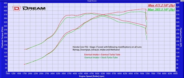 deres nye Turbo Rør blev uafhængigt testet hos Dream Automotive på en FK8 med stage 1 kortlægning. Alle tests blev udført med samme kortlægning og deres indsugningssystem og på samme dag, ryg mod ryg. OEM røret blev testet for at sætte en baseline og blev derefter skiftet til V1 røret. Dette viste en stigning på 4 hk ved top RPM som forventet. Eventuri skiftede derefter til det nye V3 rør og fik yderligere 5 hk over V1 røret ved top, hvilket svarer til 9 hk over OEM røret. Dette er omkring dobbelt så meget effekt som den tidligere version. Da volumen er større, forventer Eventuri endnu flere gevinster ved højtydende bygninger, hvor turboen kræver mere luftstrøm.