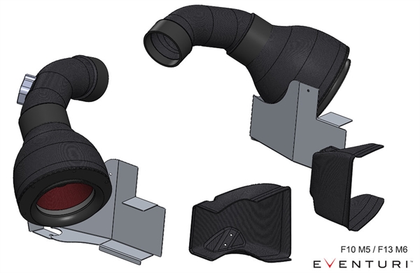 deres indsugningsrør er igen fremstillet af 100% prepreg kulfiber. Hvert rør har en integreret MAF-sensormontering, der er CNC-bearbejdet i aluminium. Rørene forbinder glat filterhusene med turboindløbene og eliminerer de originale bølgede flex-rør, som har en mere forstyrrende flowvej. Eventuri sikrede, at kulfiberrørene bevarer en ægte cirkulær tværsnitsform – også ved MAF-montering for de bedst mulige flowegenskaber.