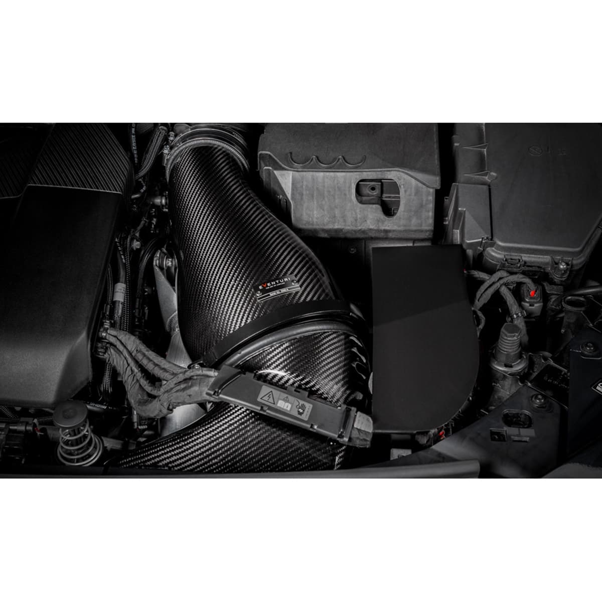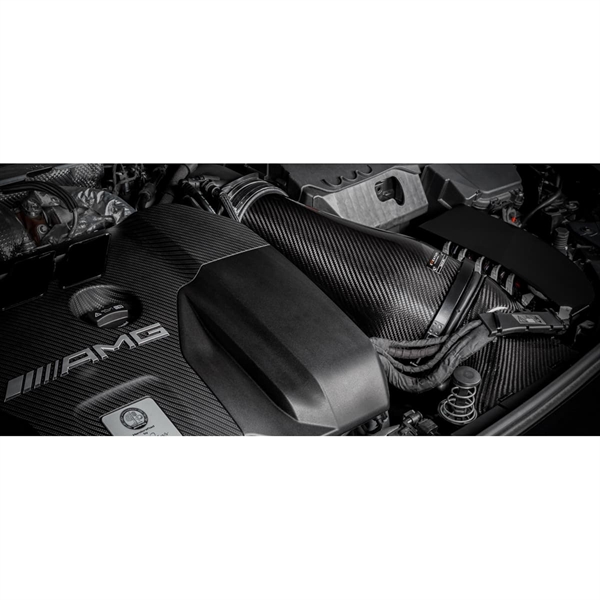 Mercedes M139 Eventuri-systemet anvender deres patenterede kulfiberhus, som skaber en aerodynamisk effektiv luftvej fra filter til turbo. Ikke blot et almindeligt keglefilter med varmeskjold, men et unikt design, der udnytter Venturi-effekten og fastholder laminær strøm for at reducere modstanden mod turboen. Du kan læse mere om husdesignet og hvordan det fungerer HER