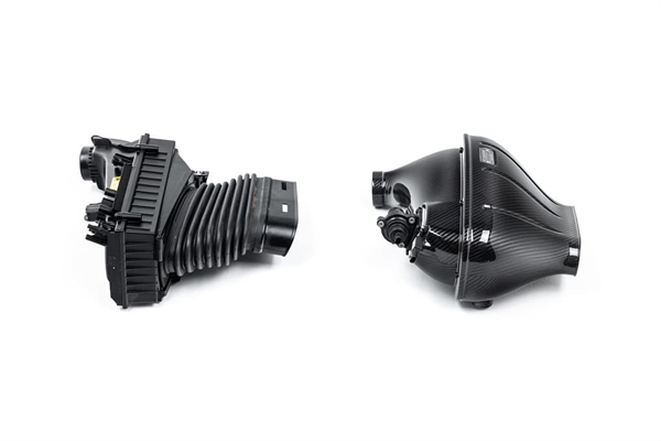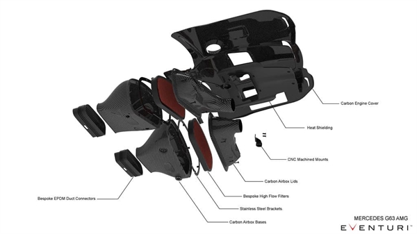 Eventuri G63 AMG indtagsystemet består af flere komponenter, designet til særskilte funktioner og fremstillet med højeste standarder. Eventuri anvender 100 % prepreg kulfiber uden glasfiber, hvilket gør det muligt at opnå en glat indvendig overflade og opretholde en jævn luftstrøm. Her er detaljerne for hver komponent og designfilosofien: