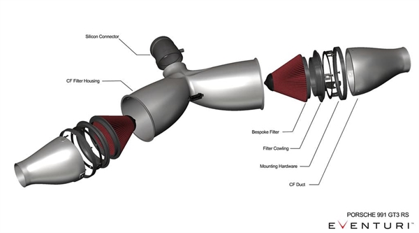 991 GT3 RS Eventuri-systemet bruger deres patenterede kulfiberhuse, som giver en aerodynamisk effektiv luftstrøm fra filter til motor. Ikke bare endnu et keglefilter med varmeskjold, men et unikt design, som udnytter Venturi-effekten. Du kan læse mere om husets design og funktion HER