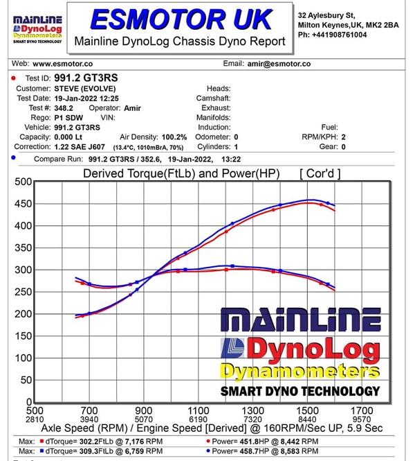 deres indsugning er uafhængigt testet af ES Motors, som bygger højtydende Porscher i Storbritannien. Testene blev udført samme dag efter hinanden på en chassis-dyno. Som det ses, er der en målbar gevinst gennem hele omdrejningsområdet, ikke kun ved top-effekt, hvilket er vigtigt, da det øgede område under grafen viser, at indsugningen har effekt ud over de angivne tal. Denne gevinst er mærkbar selv på en standardbil med bedre gasrespons og hurtigere acceleration. Den første graf viser resultatoversigten, og den anden er et screenshot af dynotesten, der viser gevinsten i mellemdrejningsområdet.